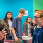 Matthew Arau talking with a student.